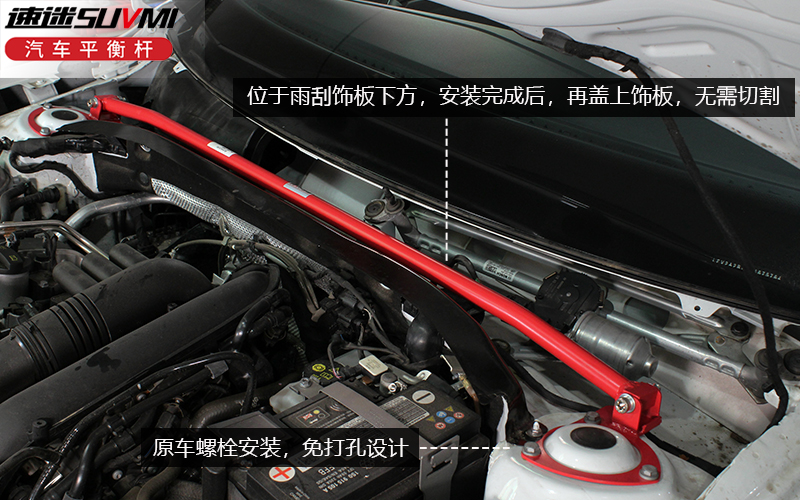 途昂安装SUVMI速迷车身加固件后,车辆底盘前-中-后全面得到进一步的强化加固,有效抑制车身扭曲,减轻弯道倾斜,增强操控灵敏度,提升行车安全稳定性能,速迷SUVMI给您带来非凡的驾驶体验。