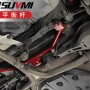 后梁支撑架,设计位于车辆底盘后梁中部上,链接着前后主/副横梁上,形成一个V字支撑结构,用于加固车辆后梁整体结构钢性强度,减轻后梁晃动量,增强车尾乘客/货物载重量,提升车辆崎岖不平路面平稳性以及高速、弯道操控稳定性。